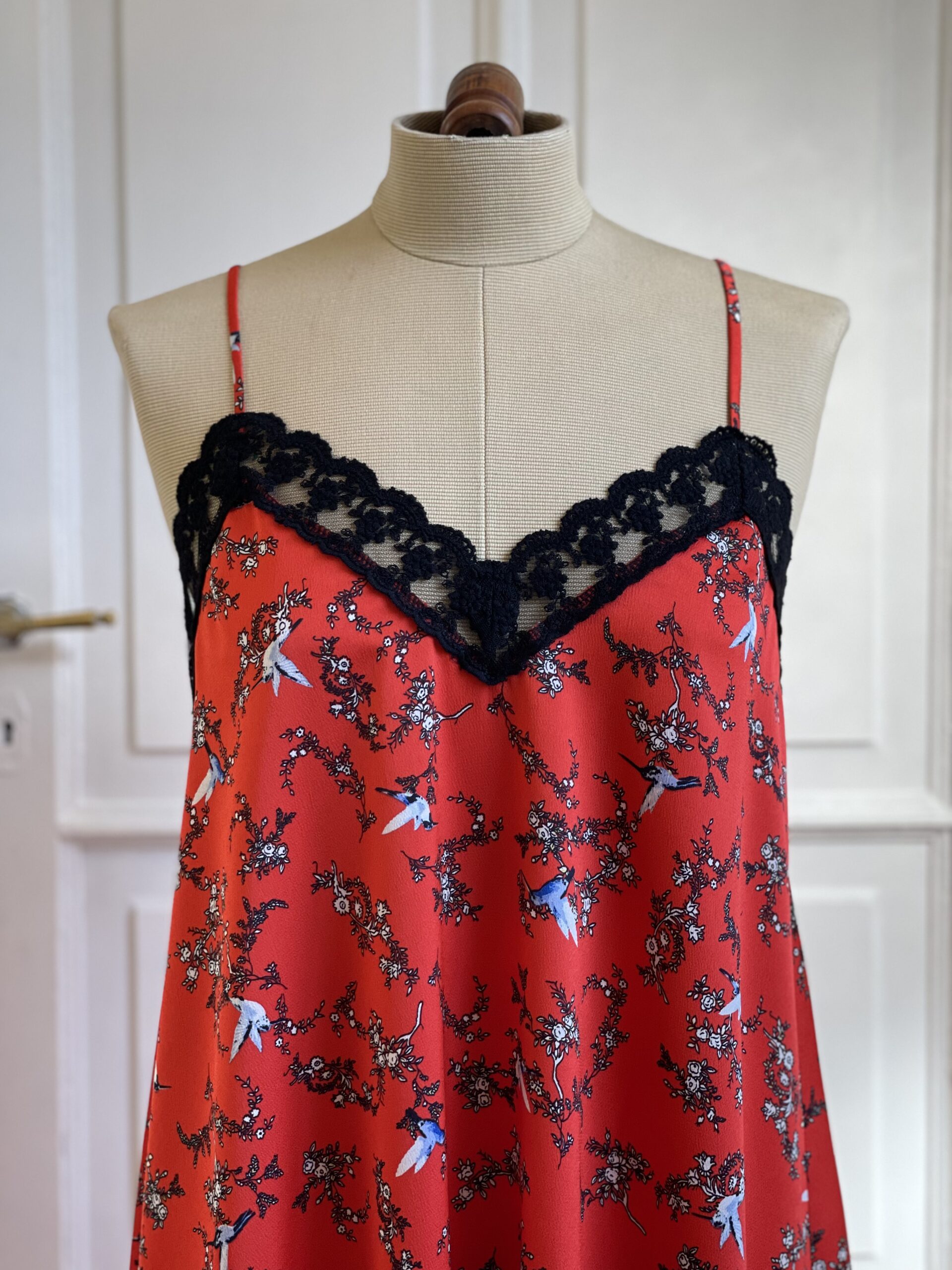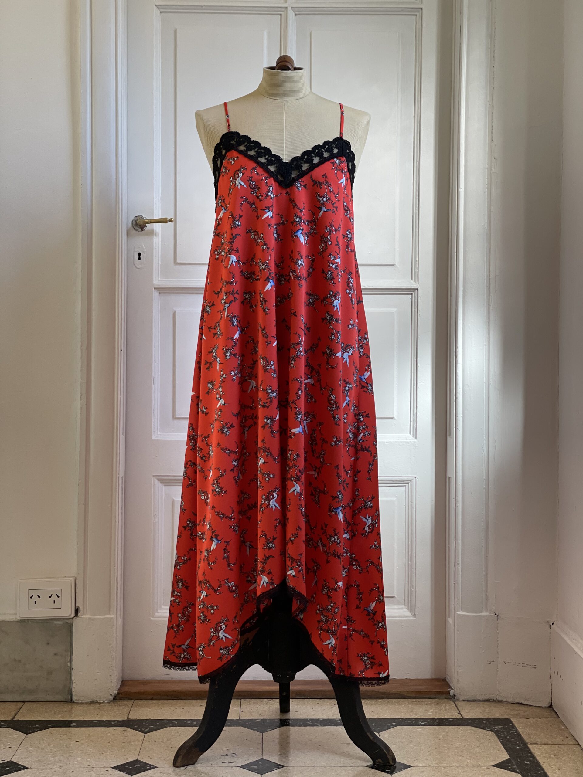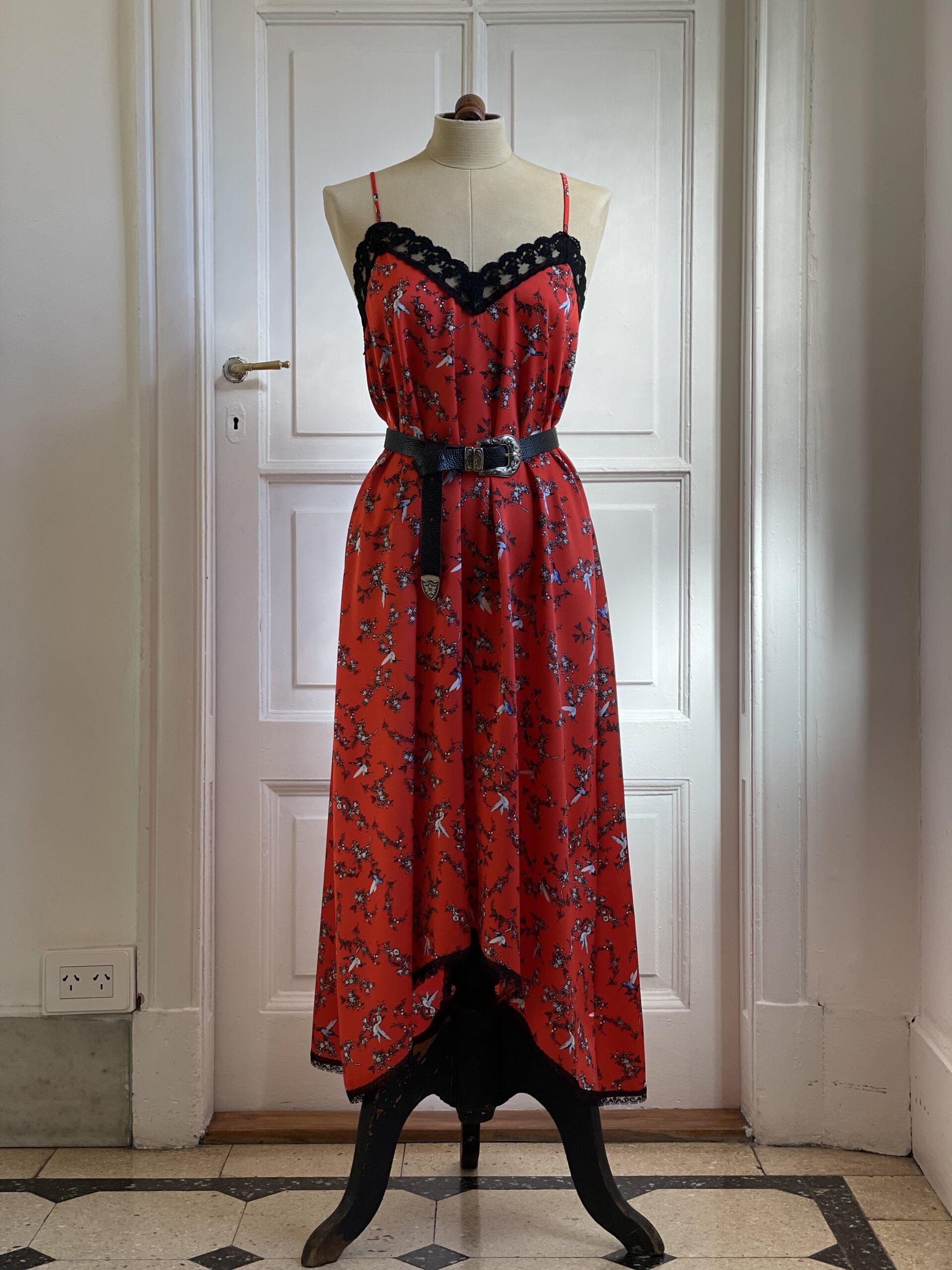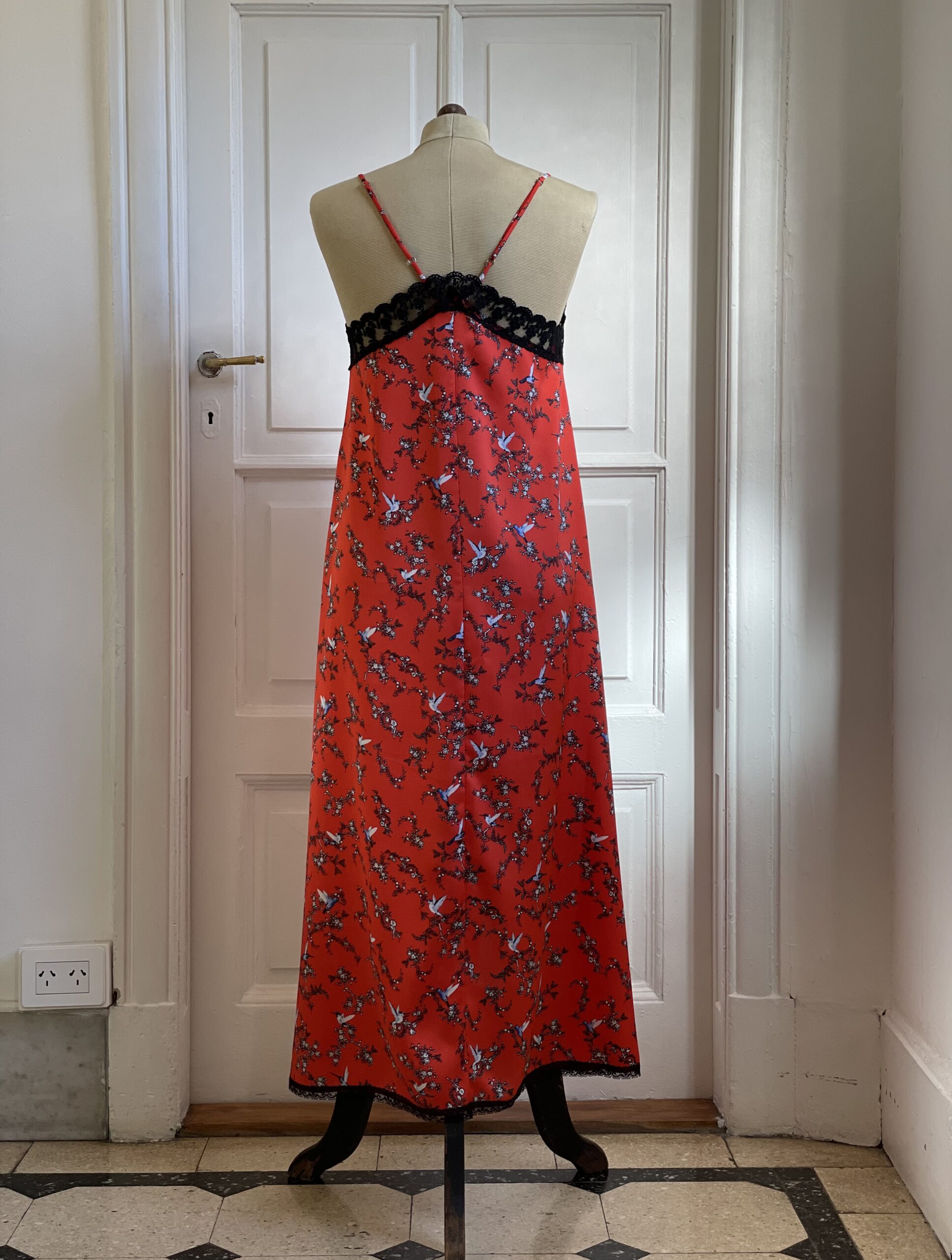 Vestido lencero de crepé de seda color rojo con diseño de flores y pájaros pequeños en negro, blanco y azul. Apliques de encaje negro en el escote, espalda y ruedo.
