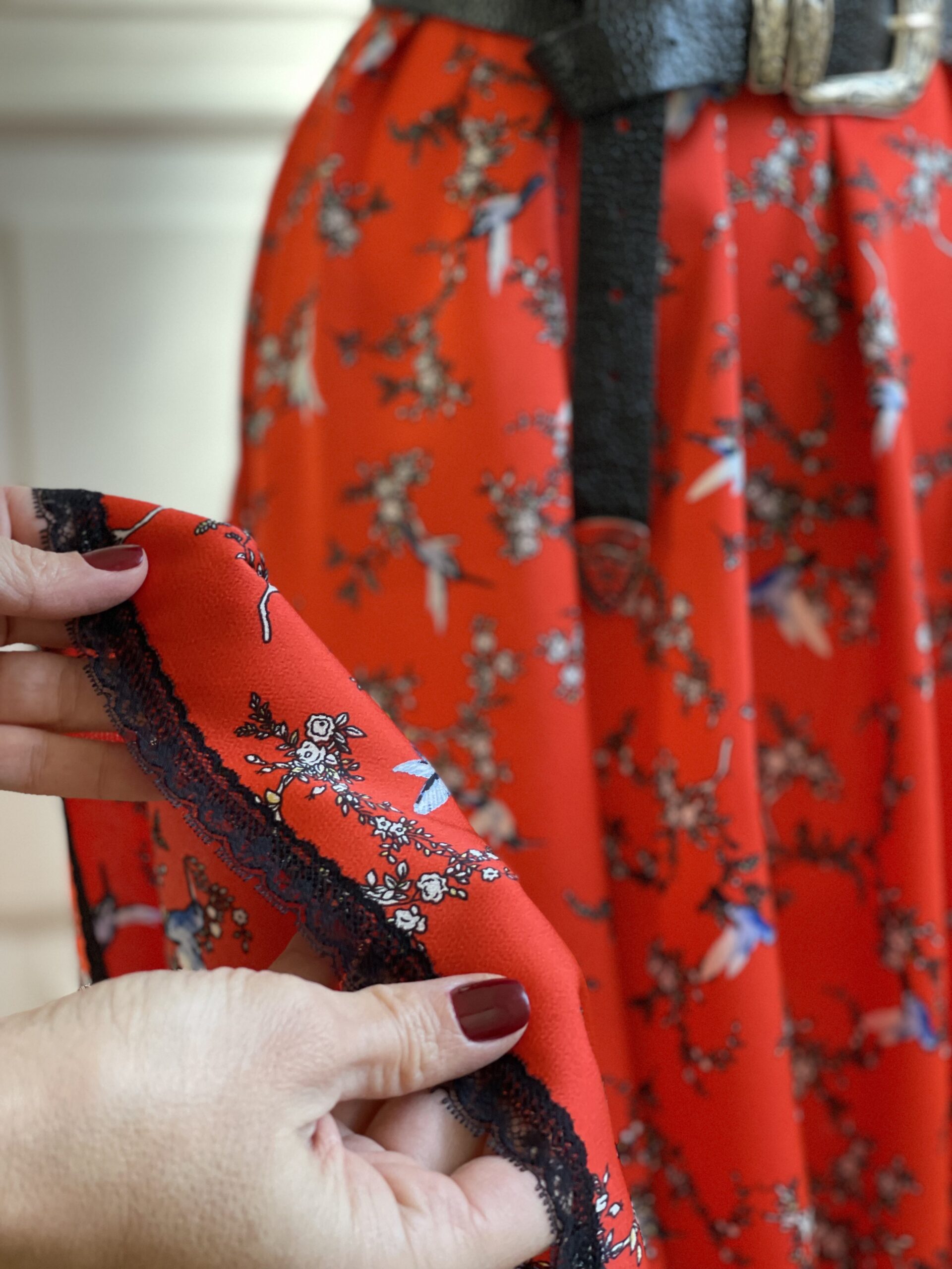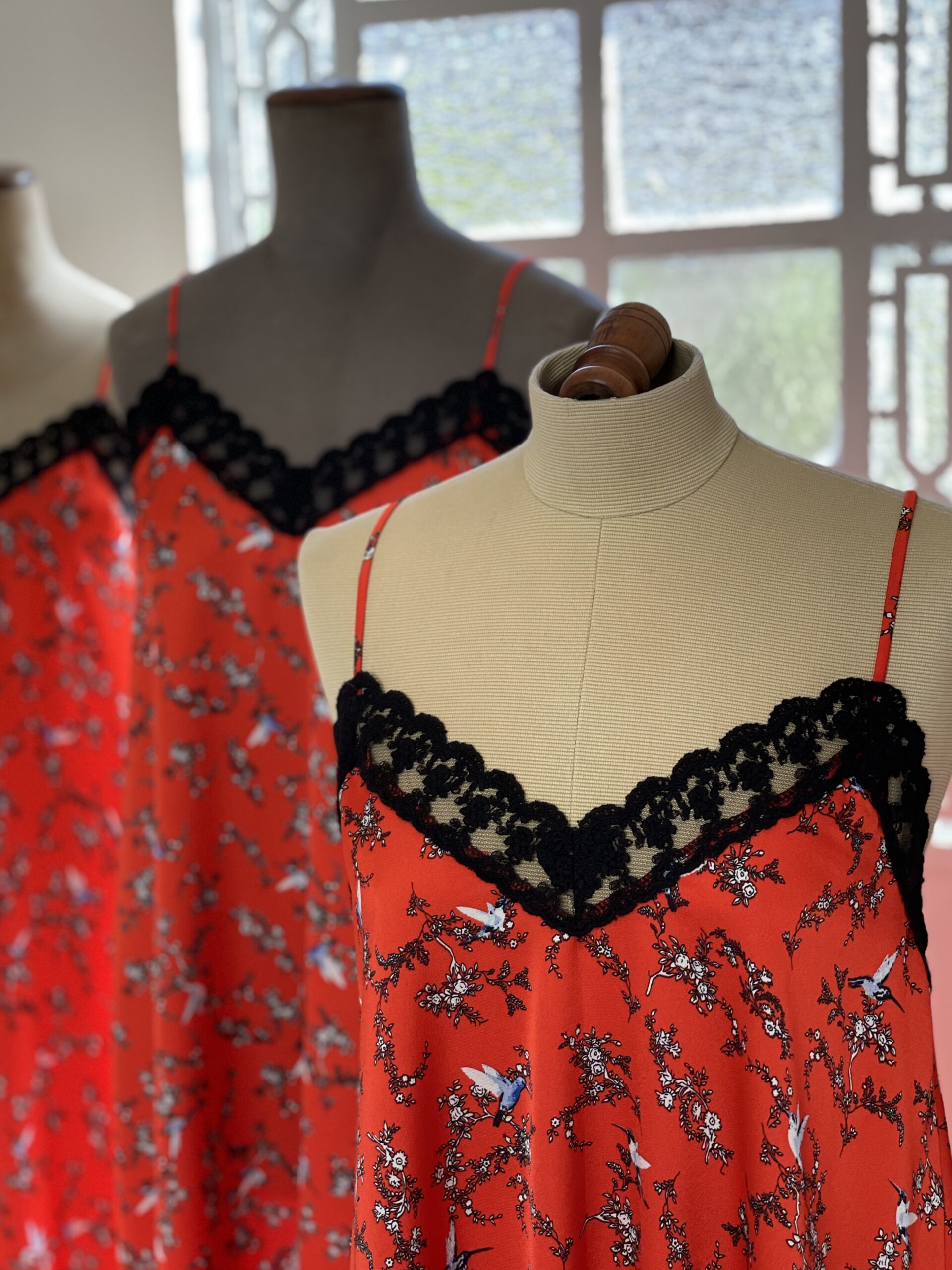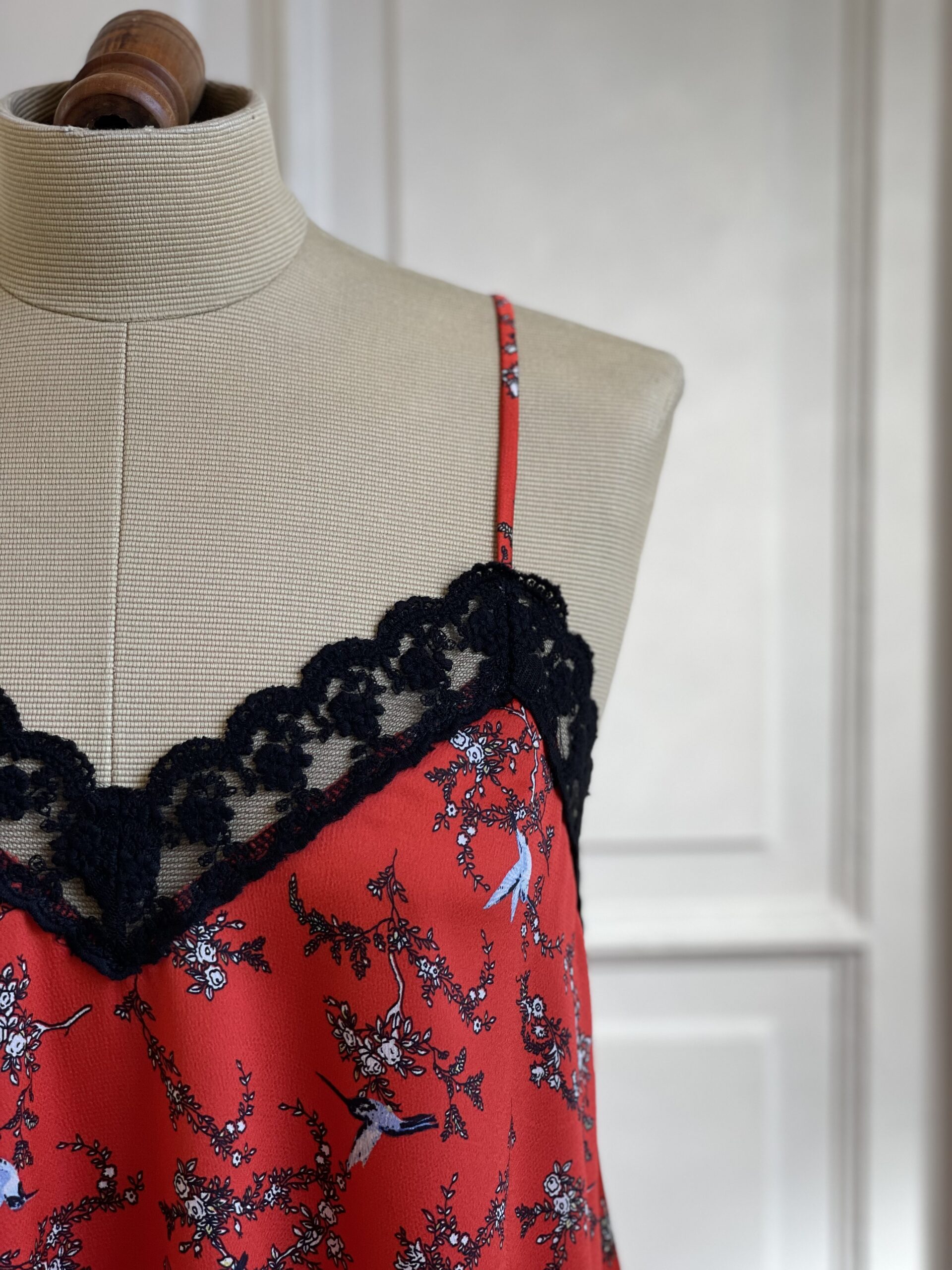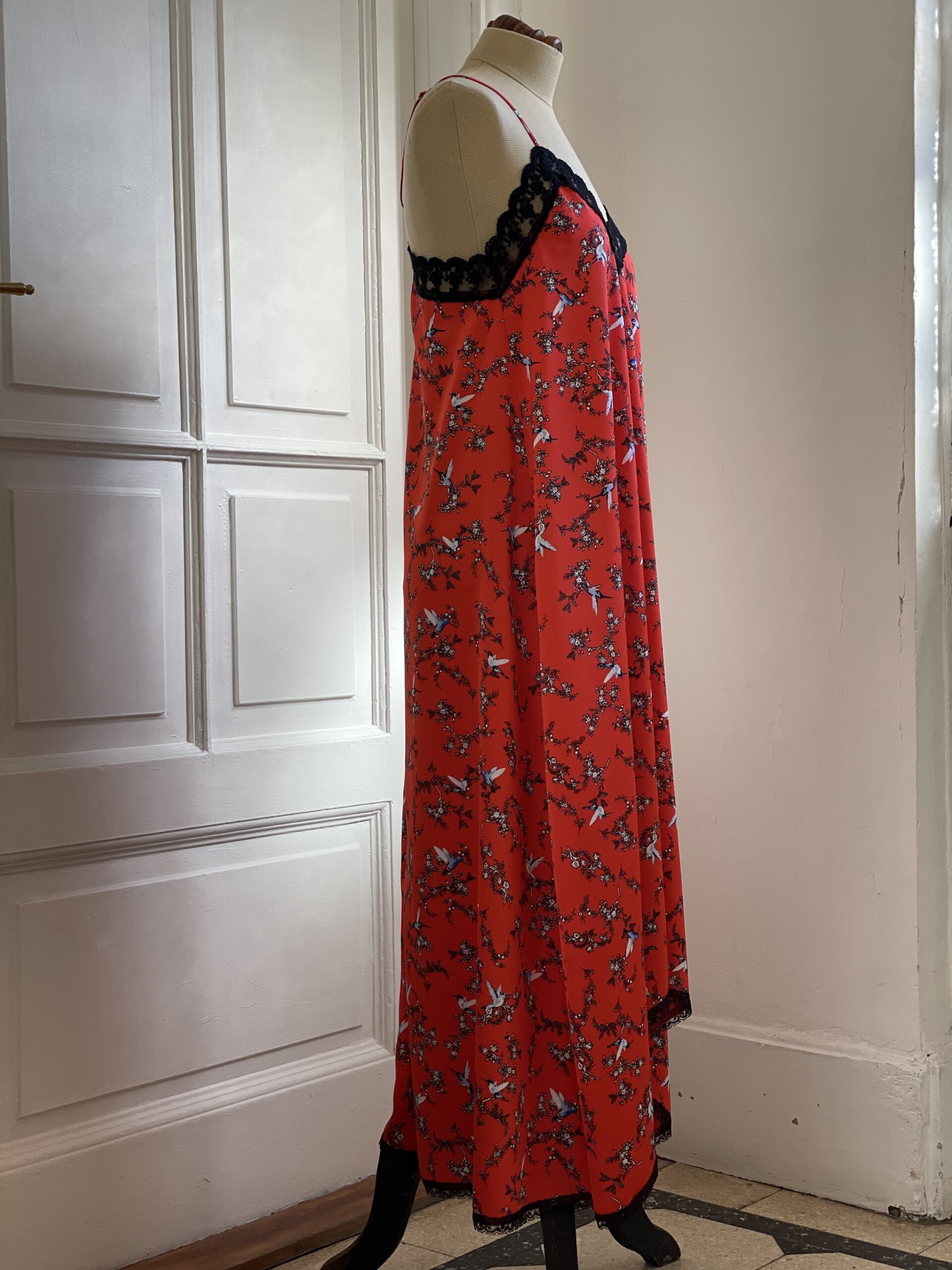 Vestido lencero de crepé de seda color rojo con diseño de flores y pájaros pequeños en negro, blanco y azul. Apliques de encaje negro en el escote, espalda y ruedo.