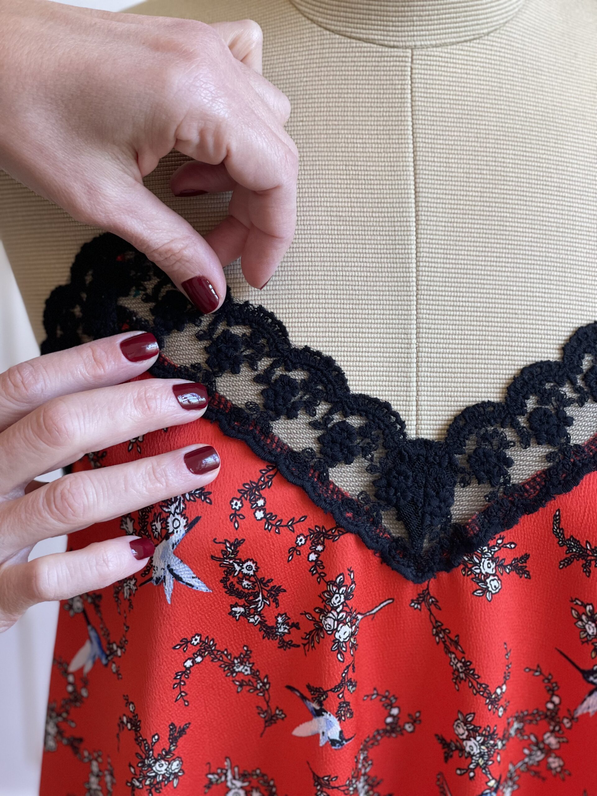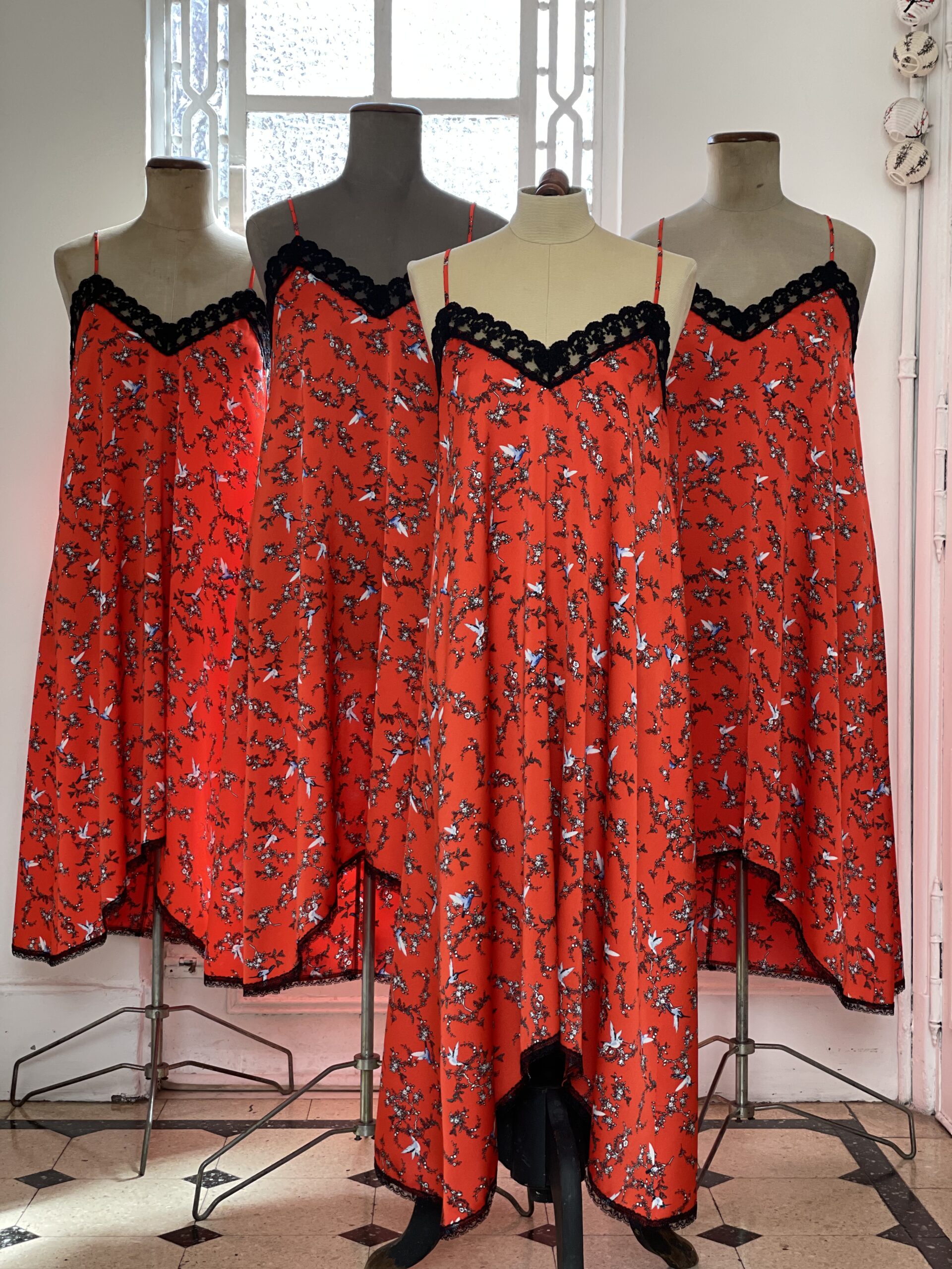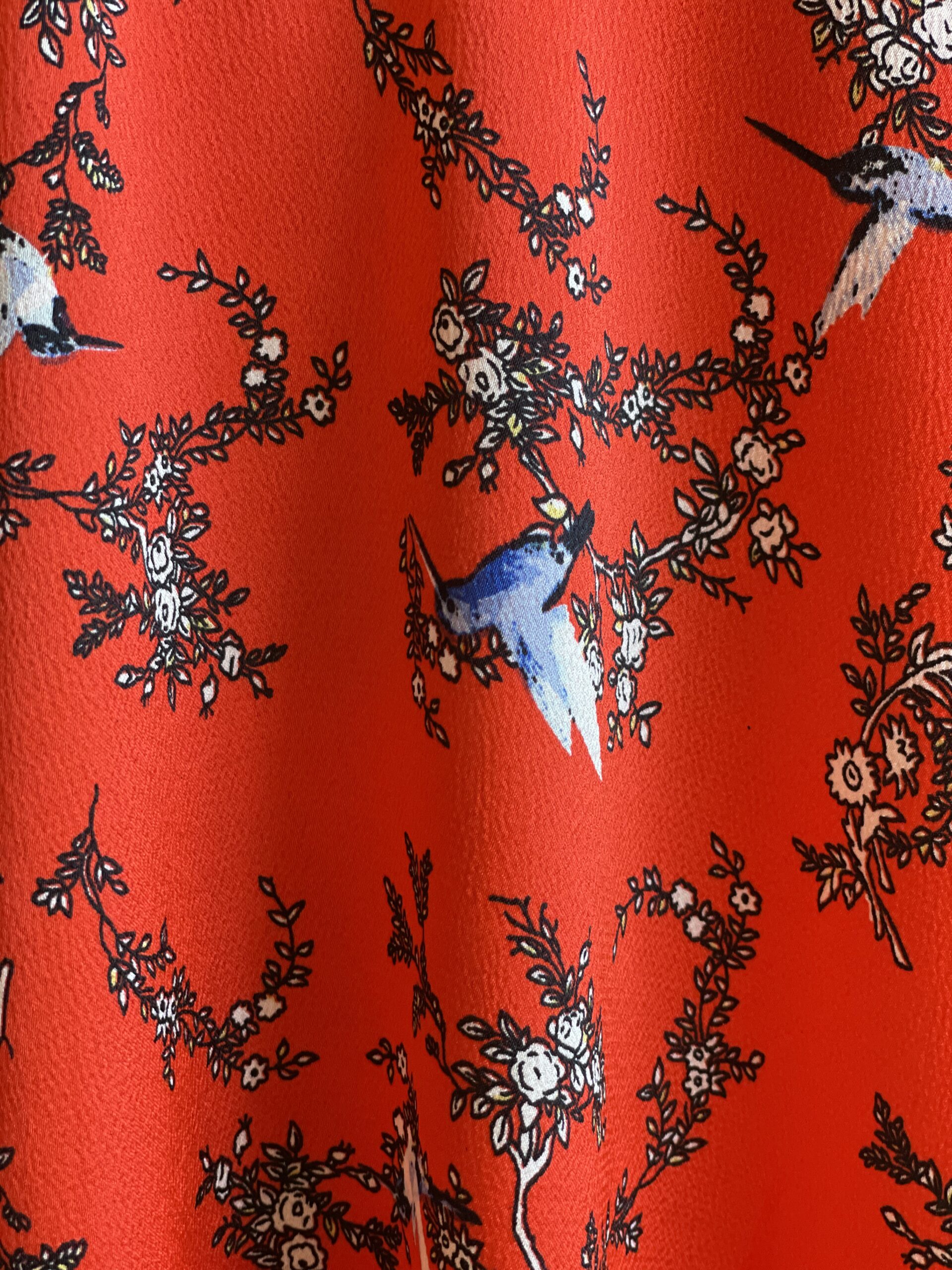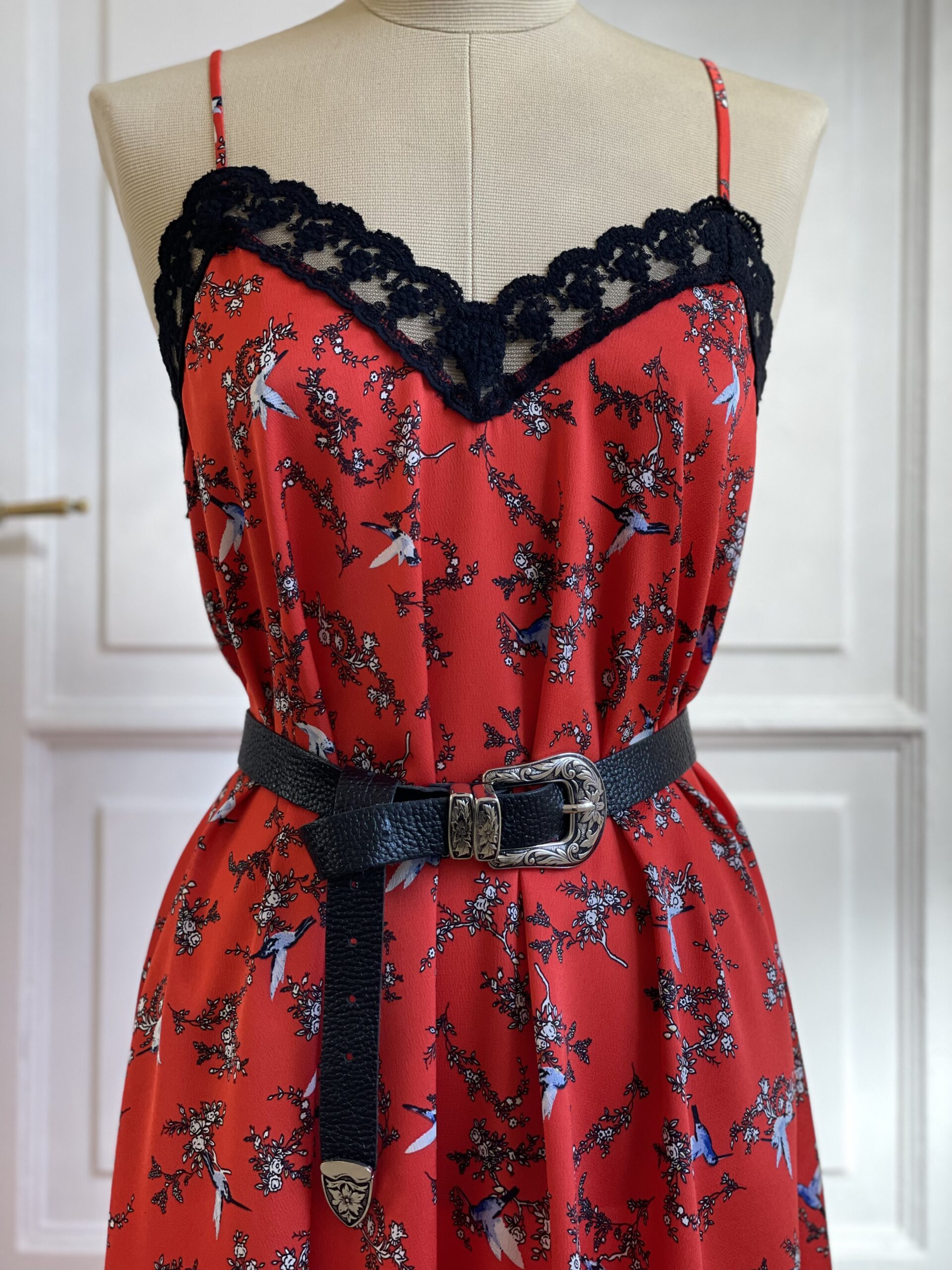 Vestido lencero de crepé de seda color rojo con diseño de flores y pájaros pequeños en negro, blanco y azul. Apliques de encaje negro en el escote, espalda y ruedo.